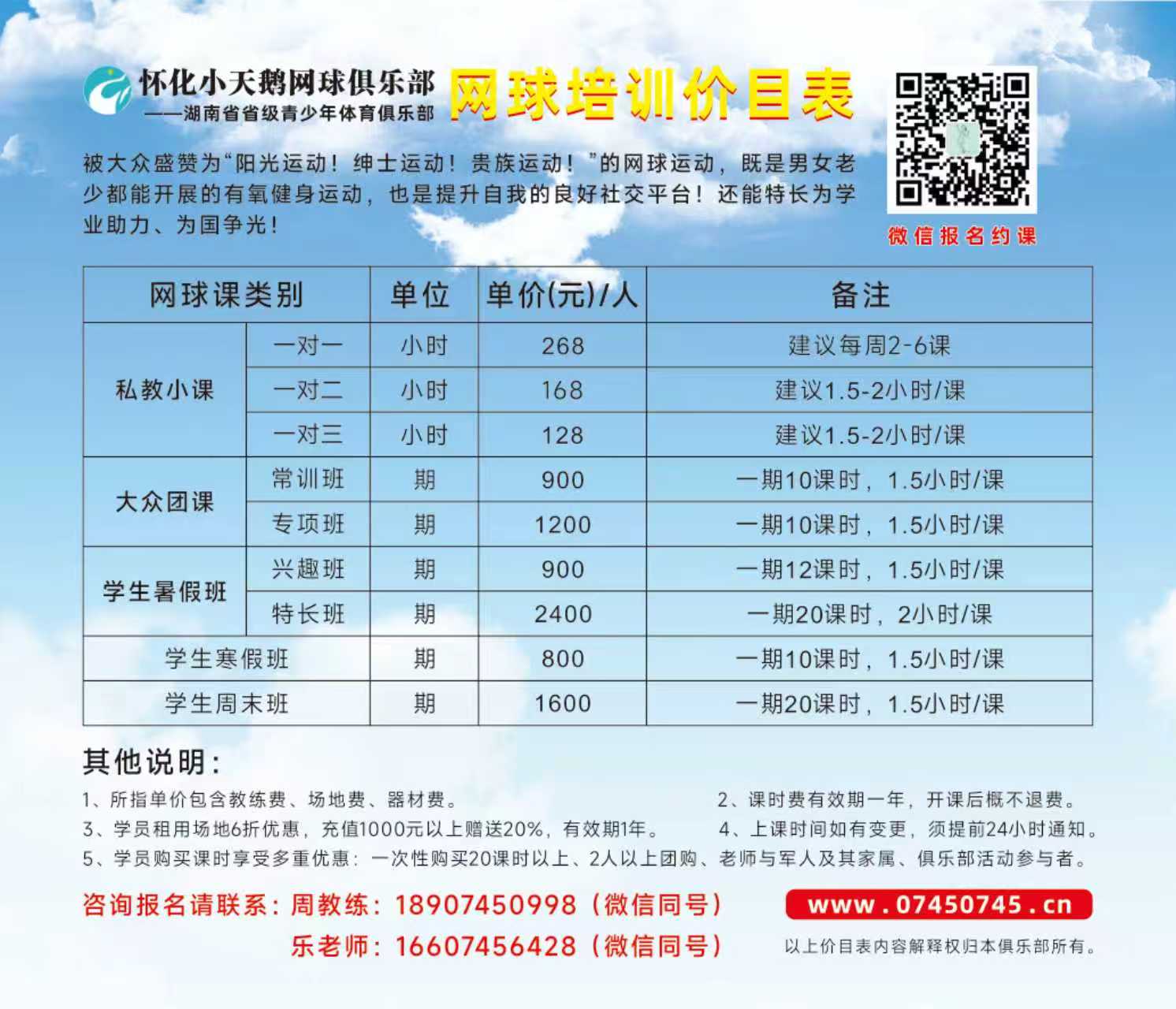 网球培训 价目表