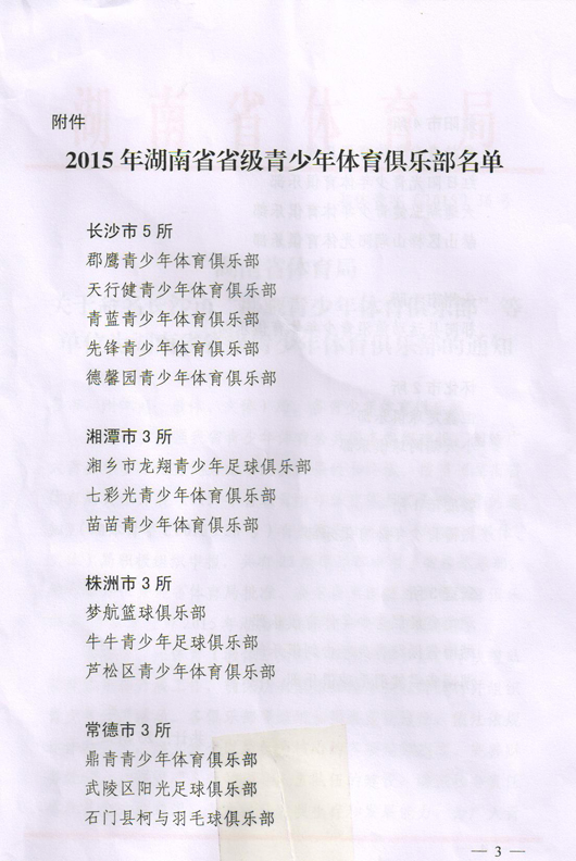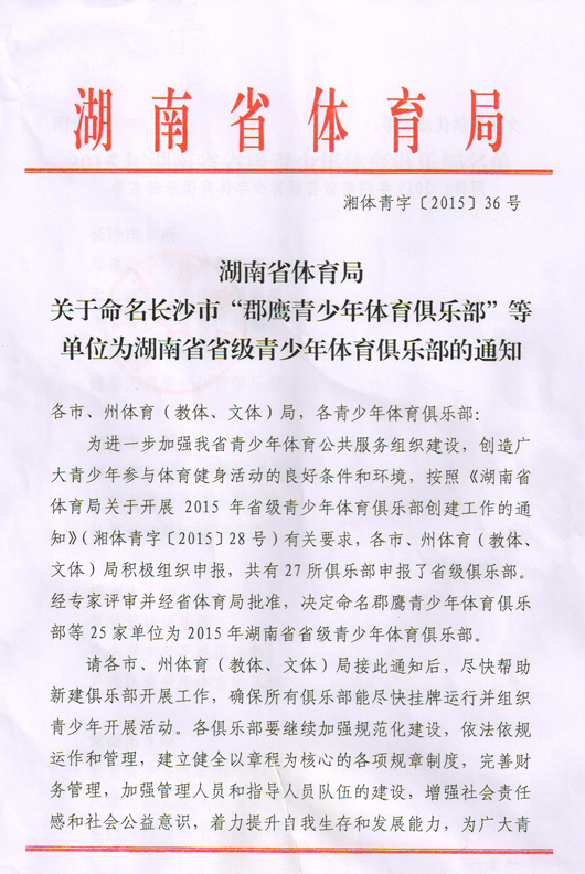 湖南省体育局关于命名长沙市“群鹰青少年体育俱乐部”等单位为湖南省省级青少年体育俱乐部的通知